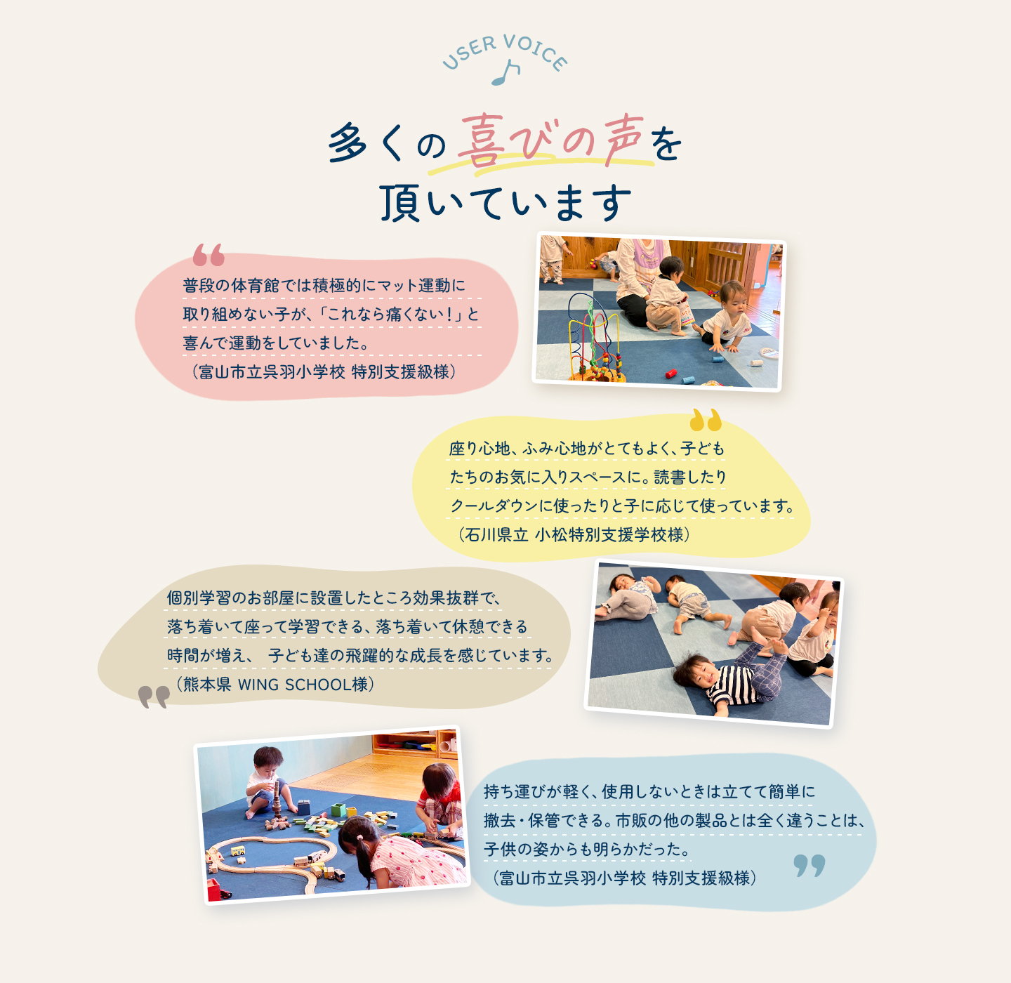 防炎仕様のため保育室や教室でも安心して使用でき、実際に導入された保育園や支援級の先生方からは「子どもが落ち着いて遊び始めた」「掃除がしやすく、ひざも痛くなりにくい」と多くの喜びの声をいただいています。